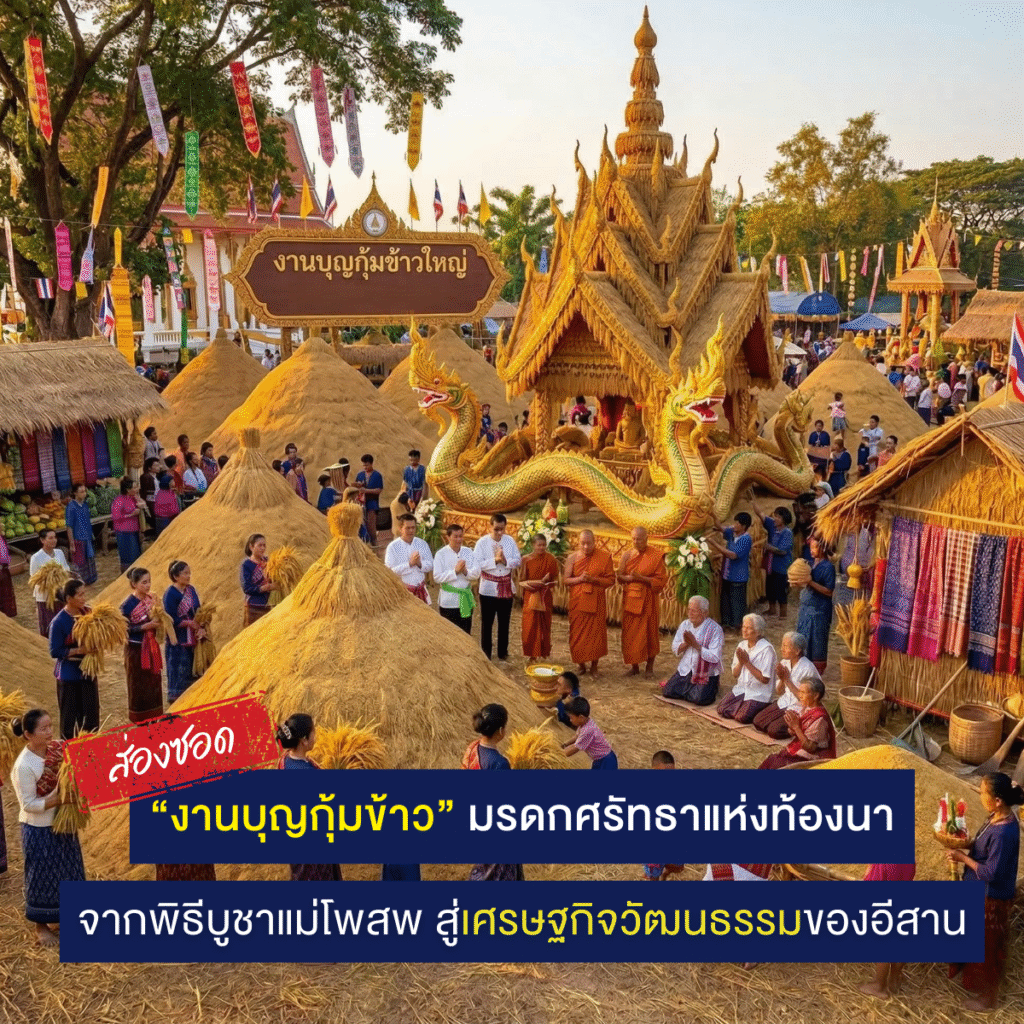 “บุญกุ้มข้าวใหญ่” คืออารยธรรมข้าวแห่งลุ่มน้ำโขง ที่ผสมผสานความเชื่อ ศาสนา เศรษฐกิจ และความสามัคคีของชุมชนไว้ด้วยกันอย่างงดงาม ตั้งแต่พิธีบายศรีสู่ขวัญข้าว การขอขมาแม่พระโพสพ ไปจนถึงการร่วมแรงร่วมใจสร้างปราสาทข้าวอันยิ่งใหญ่ ทุกองค์ประกอบล้วนบอกเล่าเรื่องราวของผู้คนที่ดำรงชีวิตด้วยผืนดินและเมล็ดข้าวมาอย่างยาวนาน และในโลกยุคใหม่ที่เศรษฐกิจสร้างสรรค์กำลังเติบโต ประเพณีโบราณนี้กลับกลายเป็น “มรดกศรัทธาแห่งท้องนา” ที่สามารถต่อยอดสู่การท่องเที่ยว การพัฒนาเศรษฐกิจชุมชน และการสร้างอัตลักษณ์ของอีสานบนเวทีโลกได้อย่างน่าทึ่งอีกด้วย