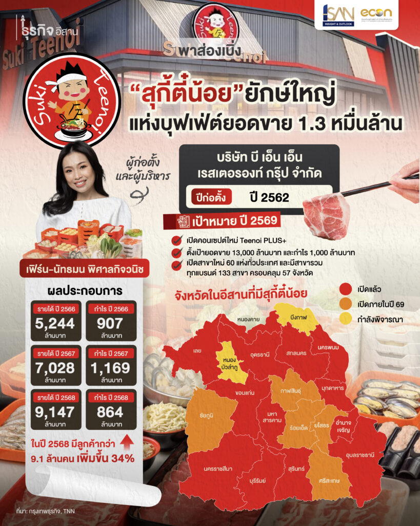 เป้าหมายในปี 2569 นี้ คือมีรายได้ 13,000 ล้านบาท พร้อมแผนขยายสาขา 60 แห่ง ซึ่งถือว่าสูงที่สุดนับตั้งแต่ก่อตั้ง เป็นการเดิมพันครั้งสำคัญของธุรกิจ โดยเฉพาะการแตกไลน์แบรนด์ เช่น “ตี๋น้อย โกลด์”, “ตี๋น้อย บาร์บีคิว” และรูปแบบใหม่อย่าง “สุกี้ตี๋น้อย พลัส” ที่มุ่งยกระดับประสบการณ์ของลูกค้า ผ่านบาร์อาหาร วัตถุดิบที่หลากหลาย และเมนูระดับพรีเมียม ซึ่งถือว่าเป็นการปรับจากการแข่งขันด้านราคา ไปสู่การแข่งขันด้านคุณค่าและประสบการณ์มากขึ้นนั่นเอง