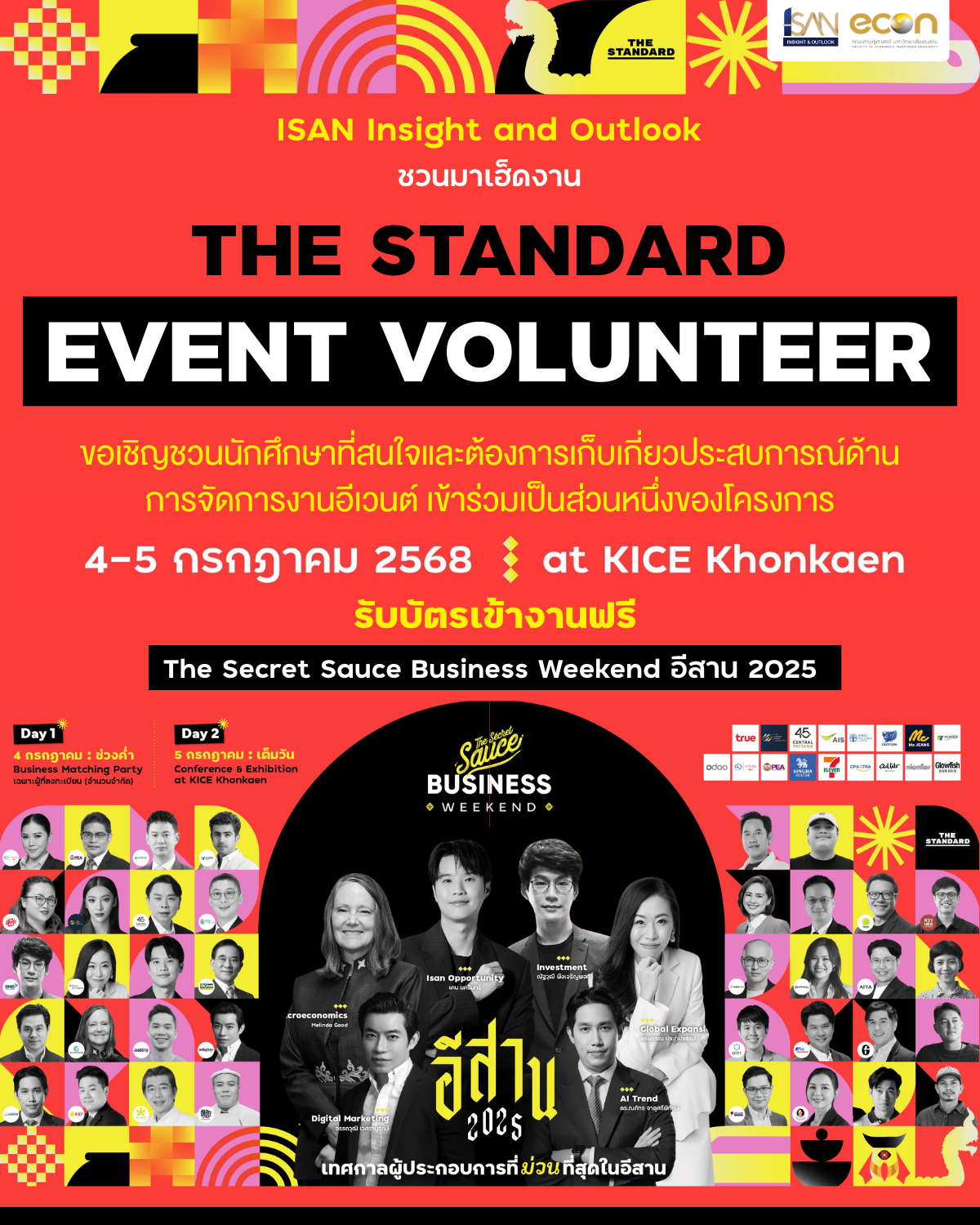 THE STANDARD VOLUNTEER ขอเชิญชวนนักศึกษาที่สนใจและต้องการเก็บเกี่ยวประสบการณ์ด้านการจัดการงานอีเวนต์ เข้าร่วมเป็นส่วนหนึ่งของโครงการ THE STANDARD EVENT VOLUNTEER ประจำปี 2568 ในงาน The Secret Sauce Business Weekend อีสาน 2025 งานสัมมนาธุรกิจระดับภูมิภาคที่ใหญ่ที่สุดในภาคตะวันออกเฉียงเหนือ จัดโดย THE STANDARD ร่วมกับพาร์ตเนอร์ชั้นนำมากมาย 📍 วันที่จัดงาน: 4-5 กรกฎาคม 2568 ณ จังหวัดขอนแก่น ภายในงานจะพบกับผู้นำธุรกิจระดับประเทศ เวทีเสวนาเข้มข้นจาก The Secret Sauce พร้อมกิจกรรม Business Trip และ Business Matching โดยเปิดพื้นที่ให้กับนักธุรกิจ นักลงทุน และคนรุ่นใหม่ ได้มาร่วมเรียนรู้และสร้างเครือข่ายทางธุรกิจอย่างเข้มข้นตลอด 2 วัน คุณสมบัติของผู้สมัคร: 🔘 อายุ 20 ปีขึ้นไป 🔘 ไม่จำกัดคณะหรือสาขาวิชาที่ศึกษา 🔘 หากกำลังศึกษาอยู่ในคณะวิทยาการจัดการ / การจัดการอีเวนต์ / การจัดการโรงแรม จะได้รับการพิจารณาเป็นพิเศษ 🔘 โครงการฝึกงานนี้จัดขึ้นตามนโยบายของบริษัท เพื่อส่งเสริมและพัฒนาทักษะให้กับผู้เข้าร่วม โดยไม่มีการจ่ายค่าตอบแทน ทั้งนี้ผู้เข้าร่วมจะได้รับอาหารทุกมื้อ ตลอดระยะเวลา 2 วันของกิจกรรม พร้อมใบเกียรติบัตรรับรองการเข้าร่วม สิ่งที่คุณจะได้รับจากโครงการ: 📌 ลงมือปฏิบัติงานจริงกับงานอีเวนต์ขนาดใหญ่ระดับมืออาชีพ 📌 สัมผัสประสบการณ์การทำงานร่วมกับผู้นำทางความคิดระดับประเทศ 📌 มีส่วนร่วมในกระบวนการทำงานของทีม THE STANDARD EVENT อย่างใกล้ชิด 📌 พบปะผู้คน สร้างคอนเนกชัน และเรียนรู้ทักษะ Soft Skill ที่ใช้ได้จริง 👉คลิกเพื่อ สมัคร 📌 (10คน) Volunteer Coordinator หน้าที่ : ประสานงาน ดูแล และอำนวยความสะดวกให้กับ Speaker ในส่วนของ Main Stage, Expertise Stage และ Business Matching ⏰ตารางเวลา 4 July 2025 11.00-12.30 น ประชุมรับบรีฟ นัดหมายการทำงานทั้ง 2 วัน 14.00-21.00 น Business Matching 5 July 2025 … Continue reading ISAN Insight ชวนมาเฮ็ดงาน THE STANDARD VOLUNTEER ประจำปี 2568 ในงาน The Secret Sauce Business Weekend อีสาน 2025