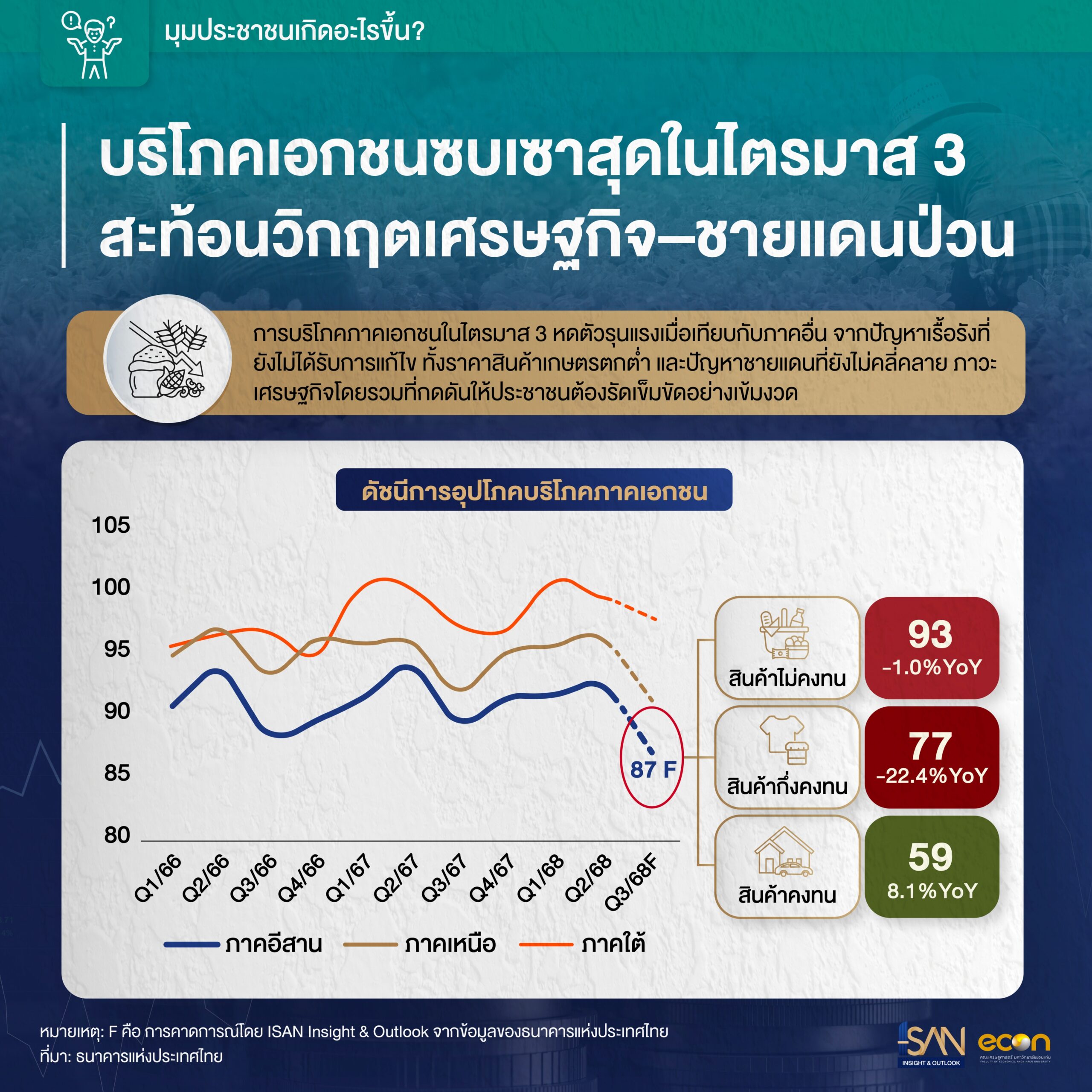การอุปโภคบริโภคภาคเอกชนในภาคอีสานไตรมาส 3 หดตัวแรงกว่าภูมิภาคอื่น สะท้อนผ่านดัชนีการบริโภคที่ลดลงชัดเจน โดยเฉพาะสินค้าไม่คงทนและกึ่งคงทน สะท้อนพฤติกรรมคนอีสานที่ต้องประหยัด ตัดค่าใช้จ่ายในสินค้าที่ไม่จำเป็นออกไป