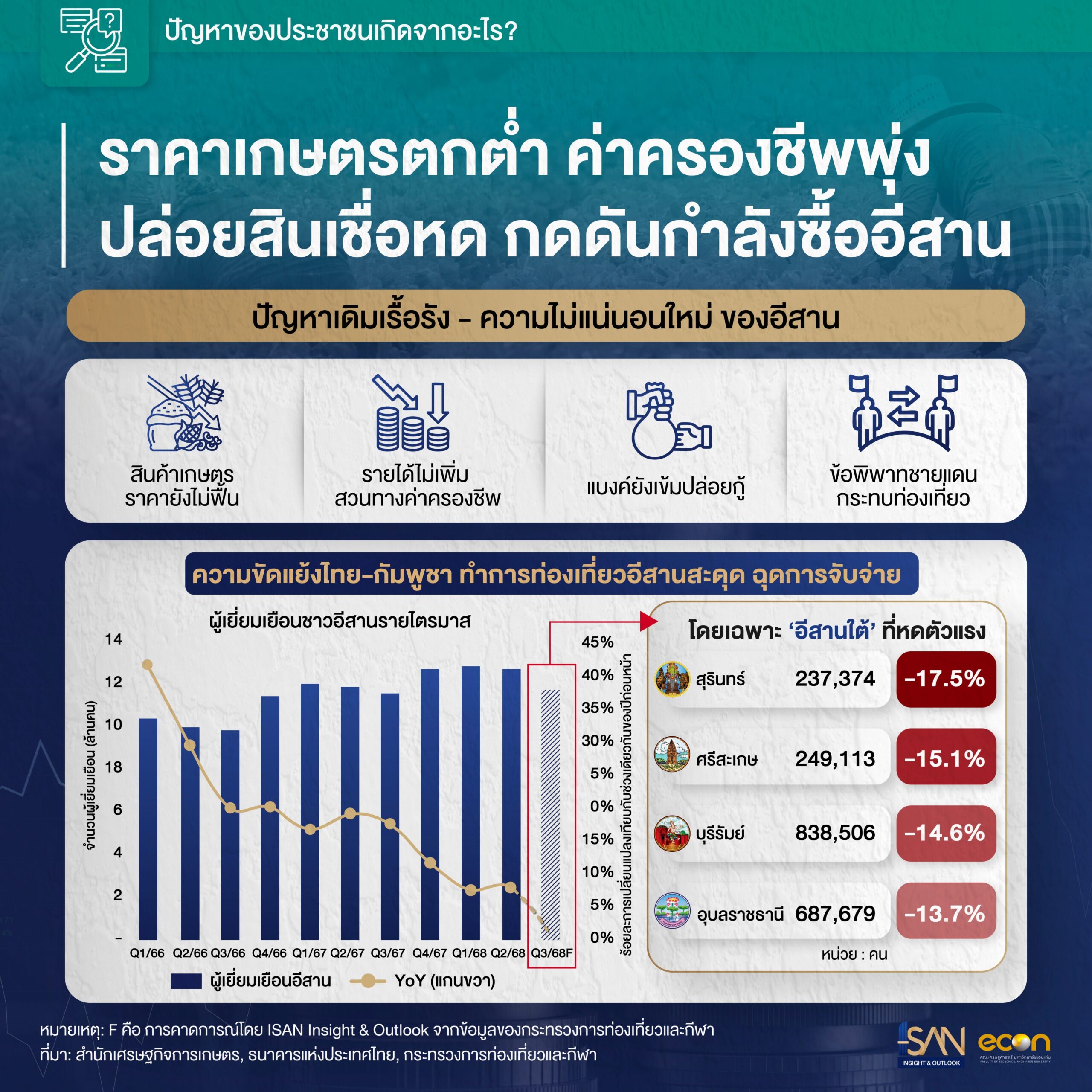 ไตรมาส 3 ปีนี้ สถานการณ์เลวร้ายลงจาก “วิกฤตความขัดแย้งชายแดนไทย–กัมพูชา” ที่กระทบโดยตรงต่อพื้นที่อีสานใต้ ได้แก่ สุรินทร์ ศรีสะเกษ บุรีรัมย์ และอุบลราชธานี ความไม่มั่นคงด้านความปลอดภัยทำให้นักท่องเที่ยวหดตัวรุนแรง ส่งผลกระทบเป็นลูกโซ่ต่อรายได้ในภาคบริการ การค้า และการบริโภคภายในท้องถิ่น