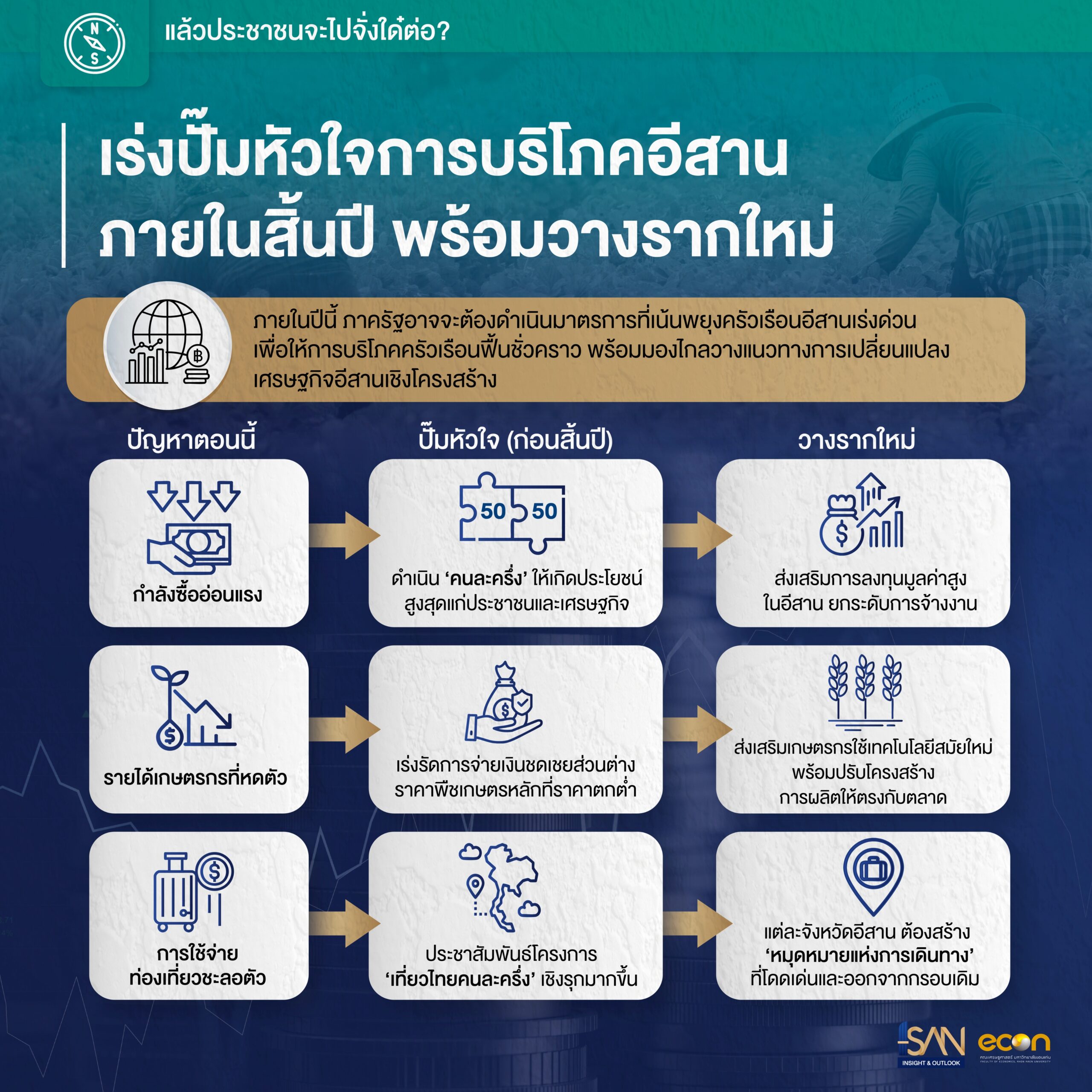 การบริโภคของอีสานกำลังเผชิญแรงกดดันรอบด้าน ทำให้การฟื้นตัวทางเศรษฐกิจเปราะบาง จึงจำเป็นต้องมีมาตรการเยียวยาระยะสั้นเพื่อพยุงการจับจ่าย และการแก้ไขเชิงโครงสร้างในระยะยาว ดังนี้