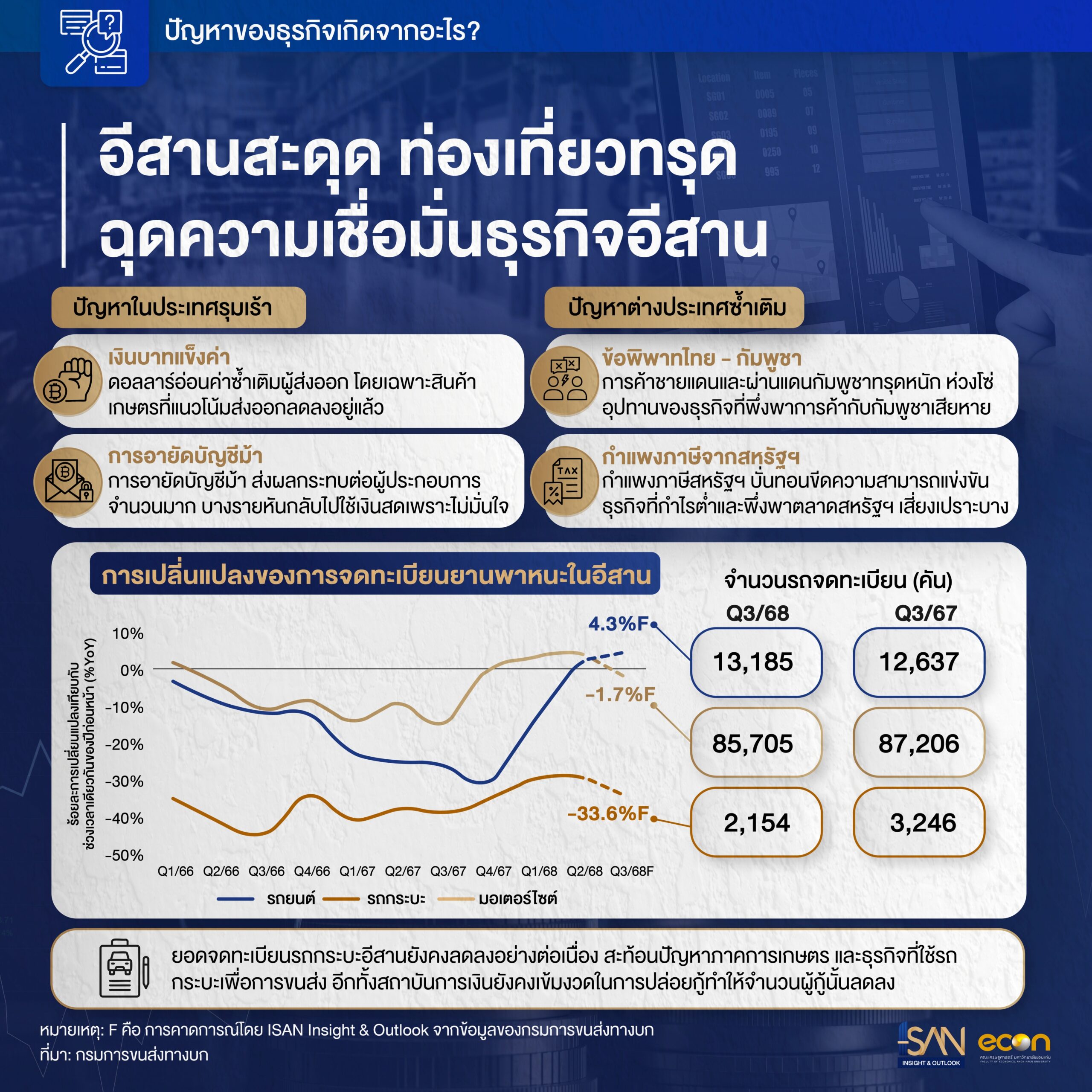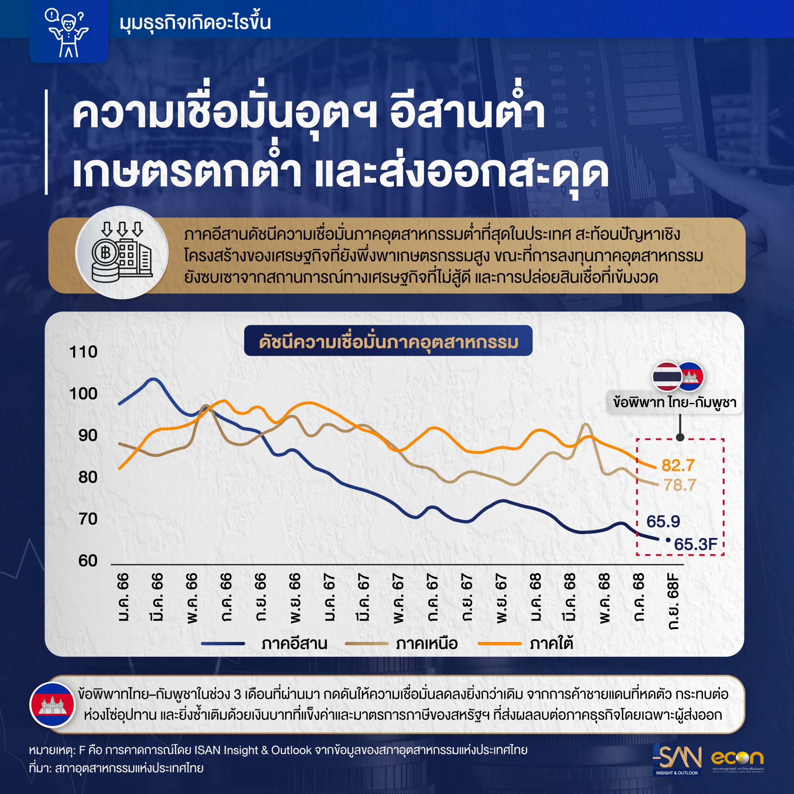 เศรษฐกิจอีสานกำลังเผชิญแรงกดดันรอบด้าน ทั้งจากปัจจัยในประเทศและต่างประเทศ ส่งผลให้ไตรมาส 3/2568 หนักหน่วงกว่าสองไตรมาสที่ผ่านมา เศรษฐกิจซบเซา ประชาชนไม่กล้าจับจ่าย ธุรกิจเจอทั้งกำแพงภาษีสหรัฐฯ ที่ปรับขึ้น และปัญหาข้อพิพาทชายแดนไทย–กัมพูชาที่ทำให้ต้องปิดด่าน กระทบต่อการค้าชายแดนโดยตรง ซ้ำเติมด้วยการเมืองไทยที่ยังไม่มั่นคง ทำให้การลงทุนในภาคอีสานชะลอตัวลง