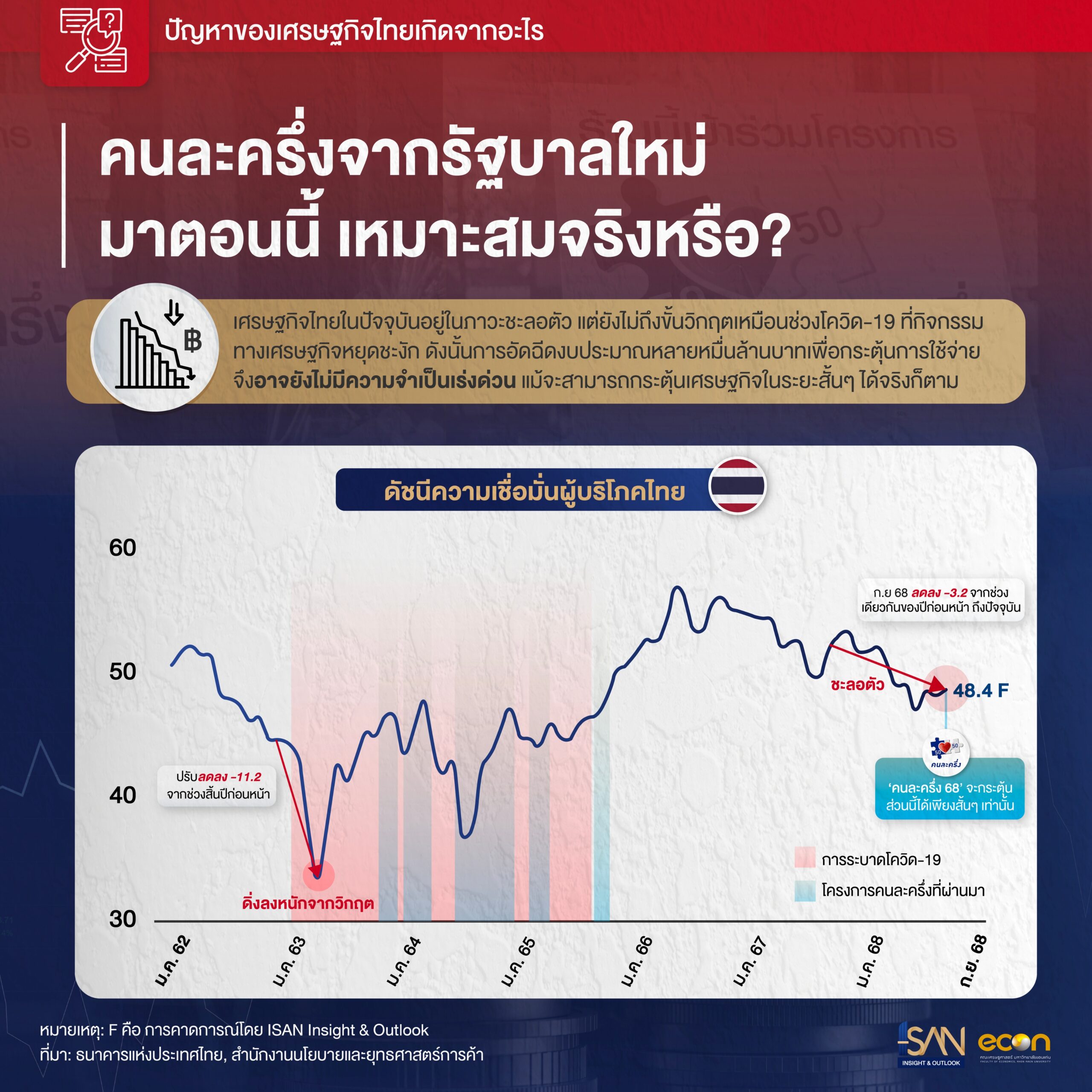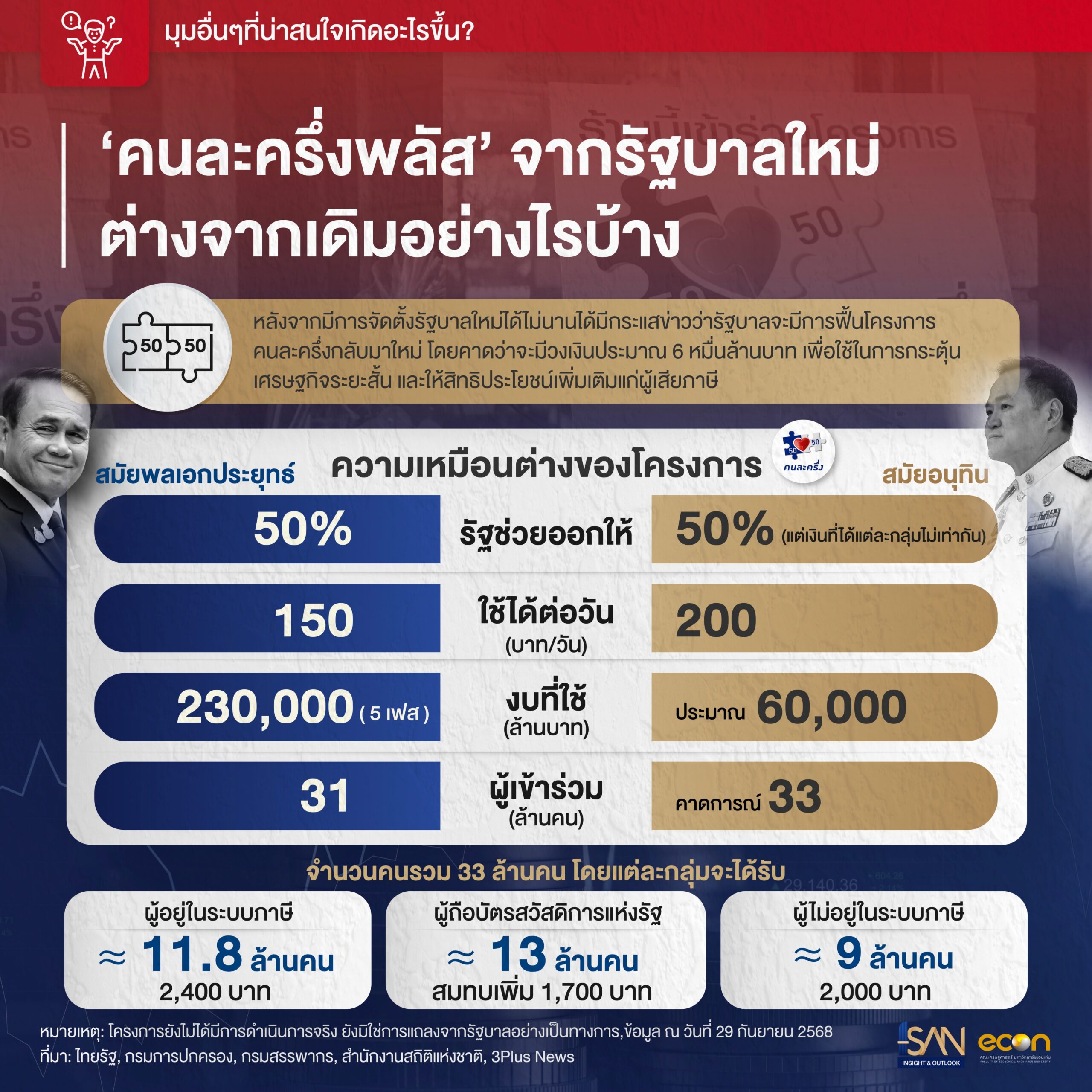 ท่ามกลางวิกฤต รัฐบาลใหม่ภายใต้การนำของนายอนุทิน ชาญวีรกูล เสนอ “โครงการคนละครึ่งพลัส” เพื่อกระตุ้นกำลังซื้อและบรรเทาภาระค่าใช้จ่าย คล้ายกับมาตรการ “คนละครึ่ง” ที่เคยใช้ช่วงโควิด-19 อย่างไรก็ตาม สถานการณ์ปัจจุบันก่อให้เกิดคำถามว่า มาตรการลักษณะนี้ยังเหมาะสมและจำเป็นจริงหรือไม่?
