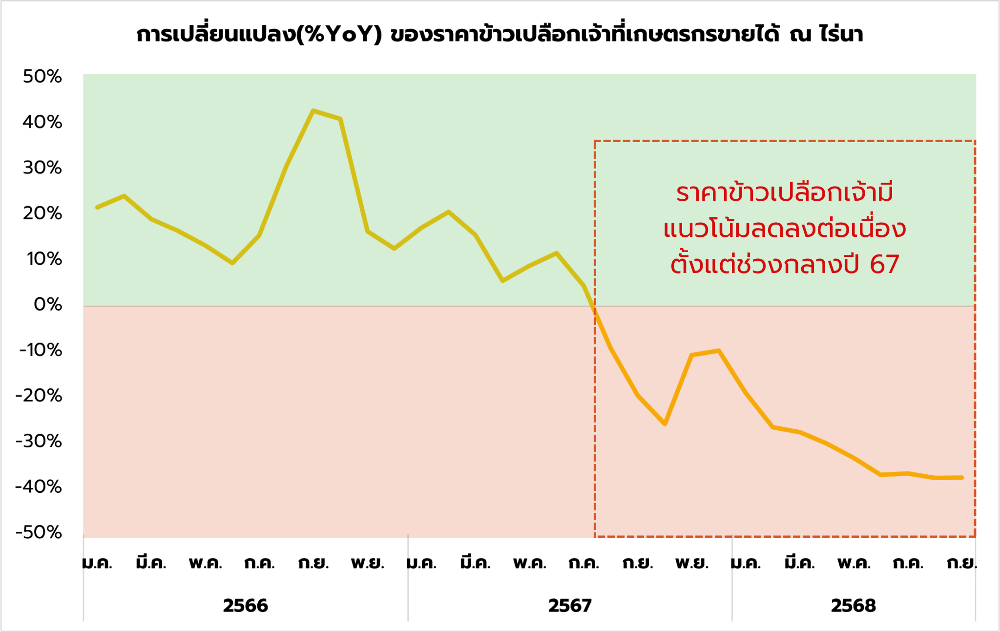 สำหรับไทย ราคาข้าวที่มีแนวโน้มอ่อนตัวต่อเนื่องอาจกระทบรายได้ของเกษตรกร โดยเฉพาะในภาคอีสานซึ่งเป็นพื้นที่ปลูกข้าวหลักของประเทศ ทั้งยังเพิ่มความเสี่ยงต่อปัญหาหนี้ครัวเรือนและกำลังซื้อในชนบท หากไม่มีมาตรการพยุงราคาหรือกระตุ้นการแปรรูปเพื่อเพิ่มมูลค่าเข้ามารองรับ