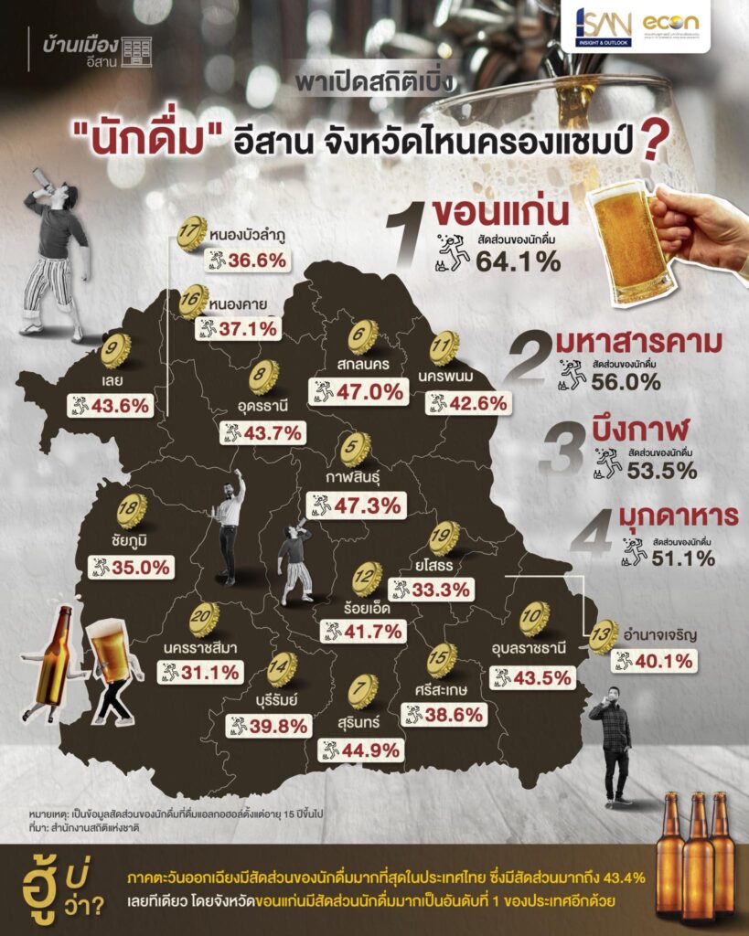 อีกทั้งยังพบว่า ขอนแก่นมีสัดส่วนนักดื่มสูงถึง 64.1% ขึ้นแท่นอันดับ 1 ของภาคและของประเทศ ขณะที่ นครราชสีมาที่มีขนาดเศรษฐกิจใหญ่ที่สุดในอีสาน กลับมีผู้ดื่มเพียง 31.1% ต่ำที่สุดในภูมิภาค