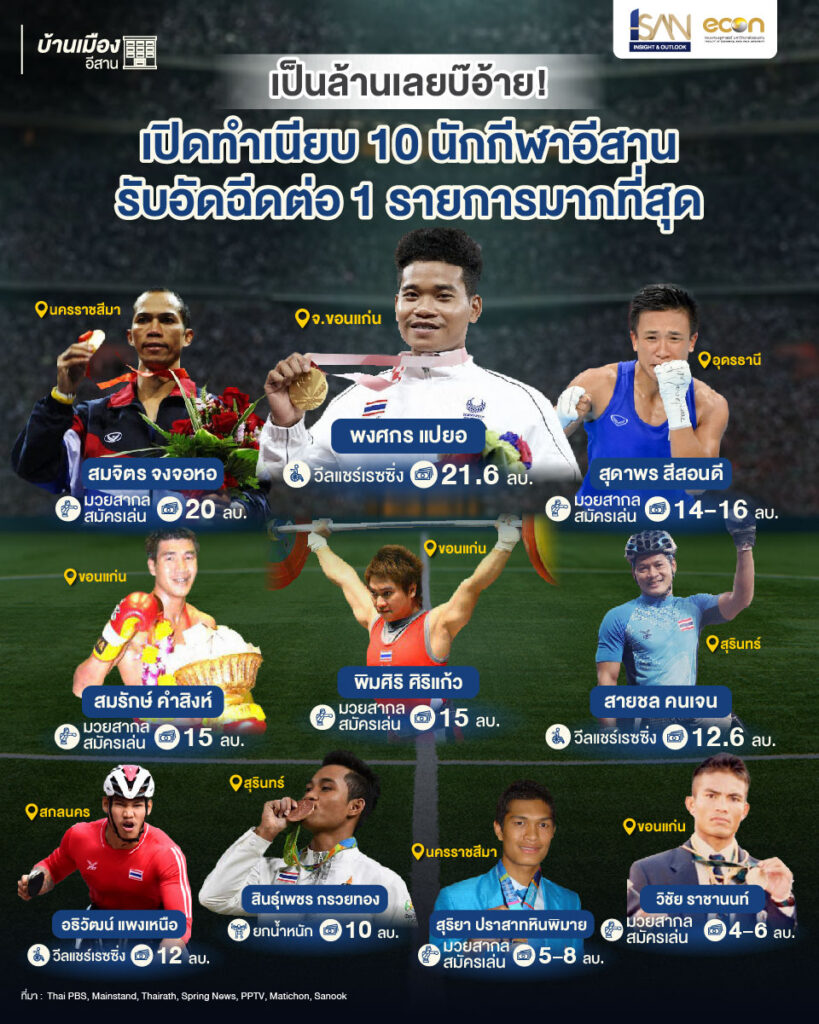 เปิดทำเนียบ “เศรษฐีนักกีฬา” เลือดอีสาน รับอัดฉีดจุกๆ ใน 1 รายการมากที่สุด โดยที่ “กีฬา” ไม่ใช่แค่ยาวิเศษ แต่คือ “โอกาสเปลี่ยนชีวิต” ของลูกหลานชาวอีสานมาช้านาน จากลานดินหน้าบ้าน สู่เวทีระดับโลก สร้างชื่อเสียงและเม็ดเงินมหาศาลกลับมาพัฒนาบ้านเกิด
